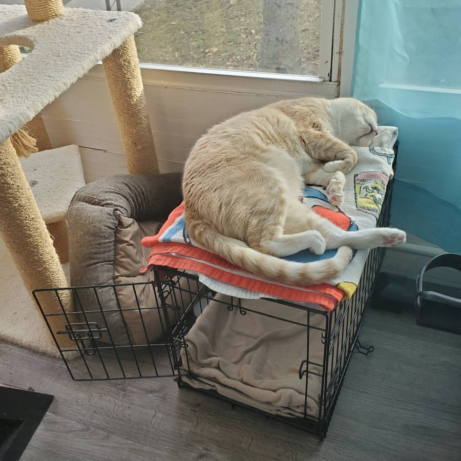 Recently, Frankie puked on the pad that was on top of the crate and I had to remove it in order to wash it. While it was in the wash, I took a cat bed that nobody uses and put it on the crate. I then noticed that Frankie had pushed the bed off the crate and was lying on top of the crate with just a towel to buffer the wires and handle connected to the top. I let him be since he was sleeping but a little while later I saw him lying on the cat bed.