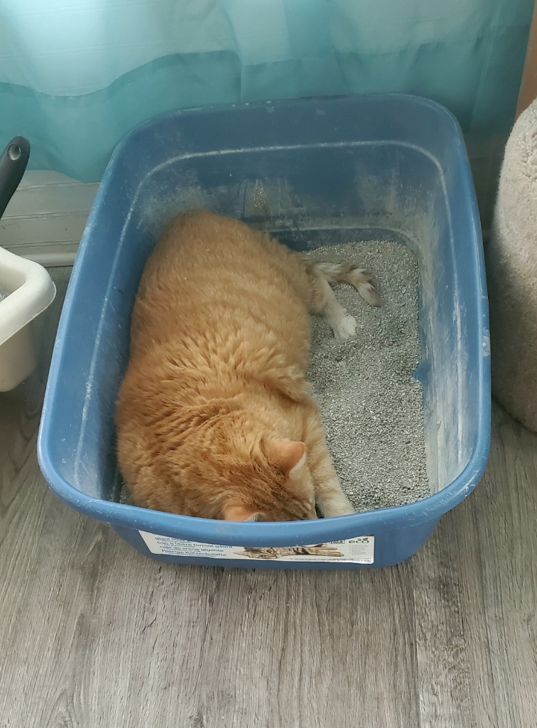 I went out into the cat room yesterday evening and saw Chris sleeping in the litter box.