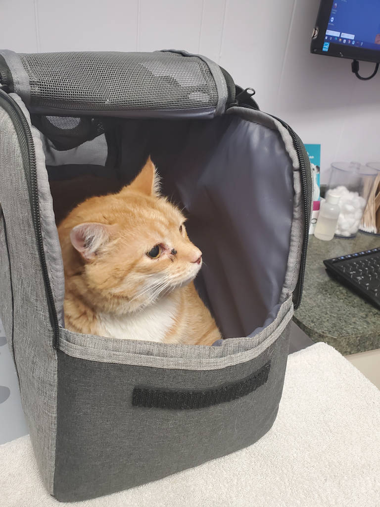 A vet tech brought us into the exam room and asked many questions before leaving. I then unzipped Chris, but he was in no hurry to get out of his carrier.