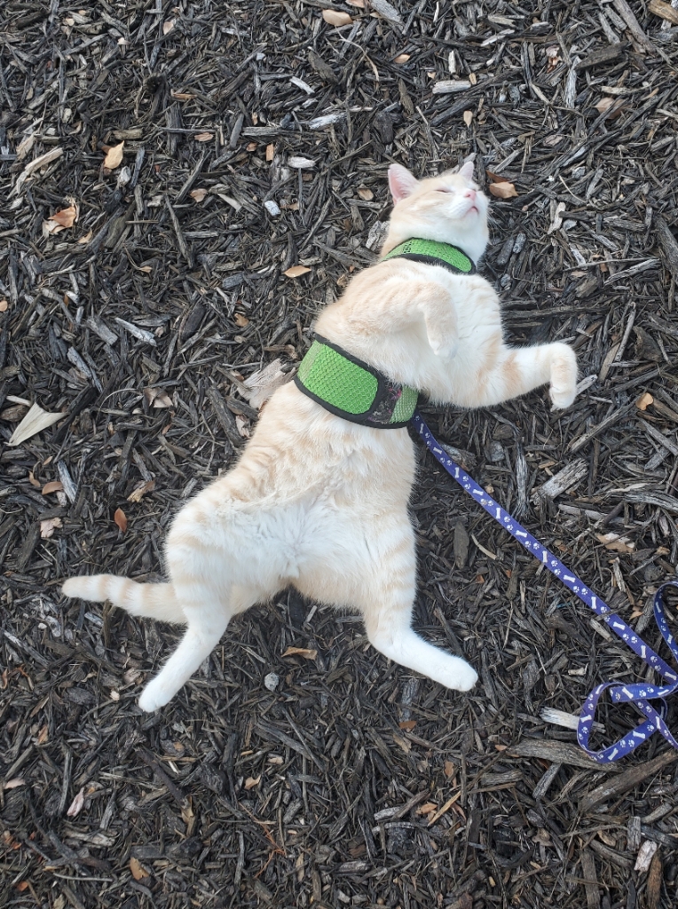 Walking a cat is fraught with unplanned delays from sleep attacks to stopping to eat some grass or smell a flower. I think walking a cat is a meditation on taking it easy, not one of exercise!