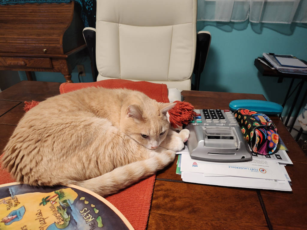 Frankie’s favorite napping spot seems to change more often than a politician changes their mind. Lately he has taken to lying on the dining room table near where Rose works.