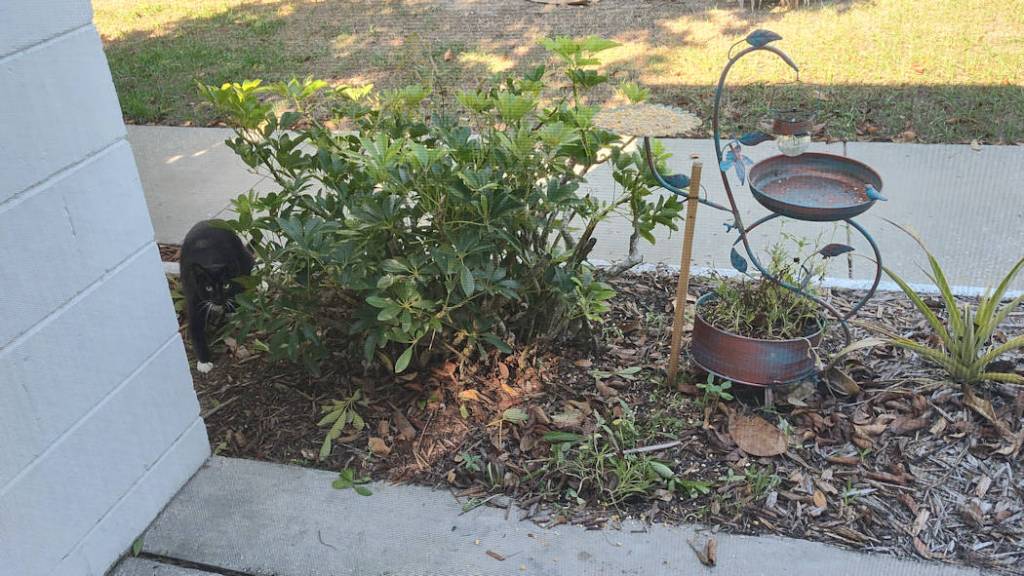 It ran away and returned sometime later. This time our neighbor’s cat Frankie saw it and forced it off the feeder and into the bush below. We cheered Frankie on, but rather than go after it, she just stood there waiting for it to come out.