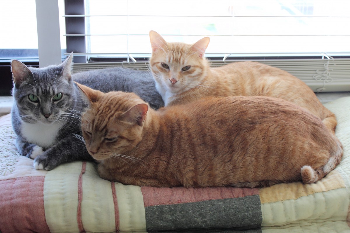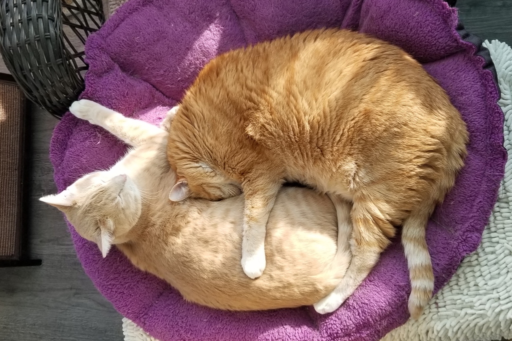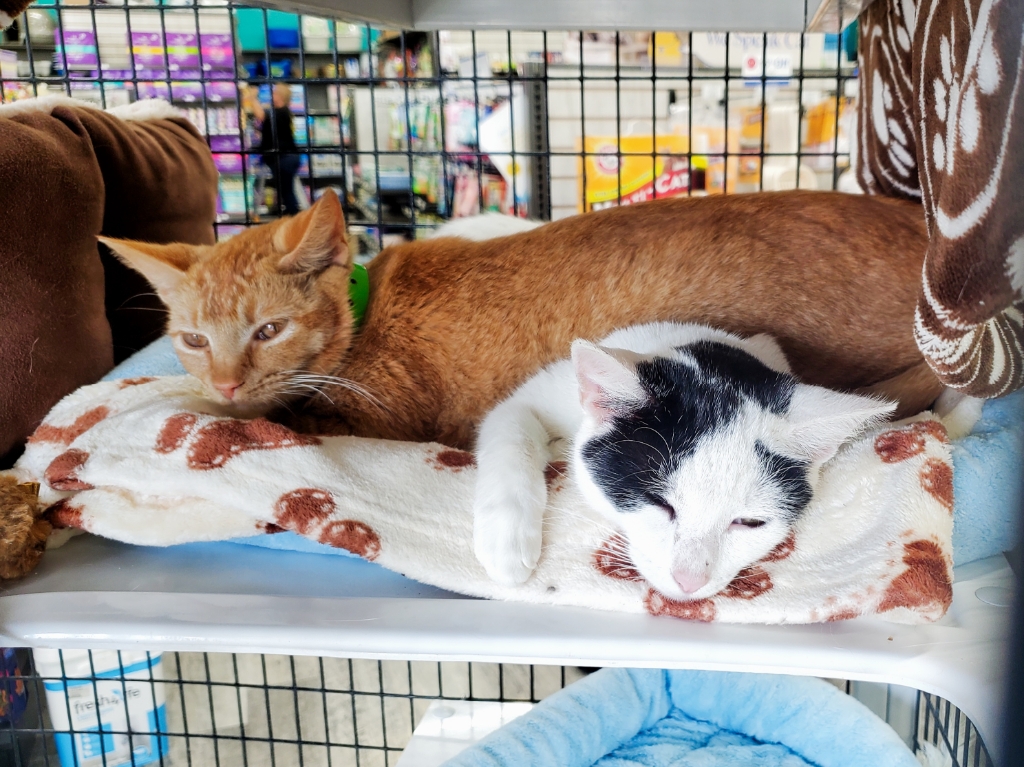 I saw these two cats today at a Pet Supermarket in Largo, Florida. I was struck by how the ginger was lying completely on top of the white and black cat.