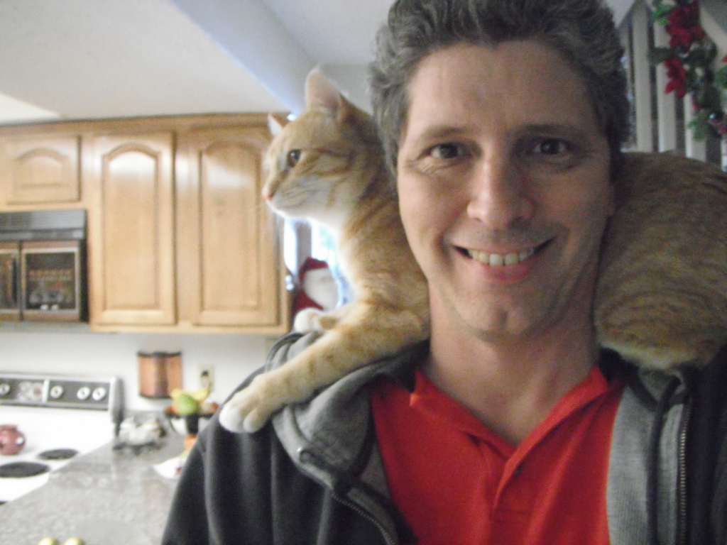 Still, we didn’t adopt him because we were not ready. We had a cruise coming up and my wife had a business trip to go on after the cruise. While she was on that trip, I went to the shelter and saw that Chris was not only still there, but he also climbed up onto my shoulders again. A shelter worker took a picture of me and Chris with my phone, which had a bad camera even for 2009 standards.