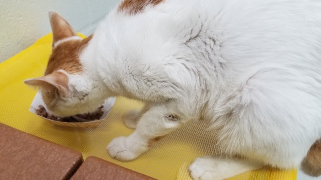 I expressed my concern about her weight and the employee said she would make a note of it and watch her. If she didn’t improve they might have to remove her from the pod and isolate her. I hoped that wouldn’t happen but sometimes a bully cat can keep another cat from eating. She brought her a container of wet food and asked me to watch and make sure nobody took it from her, which I did. I then noticed a sore on her front leg which I also mentioned.