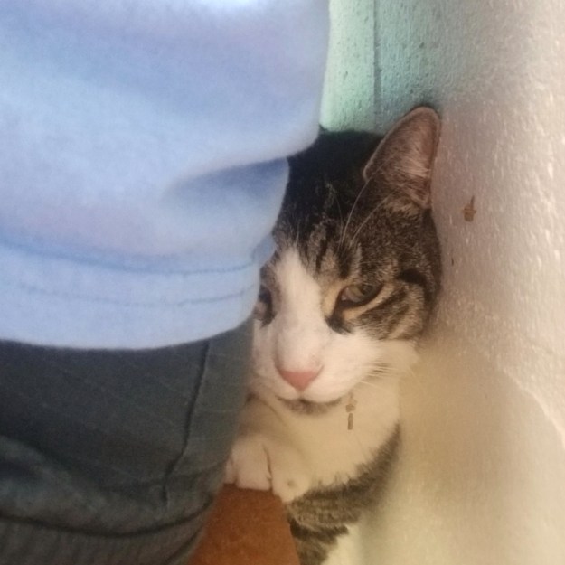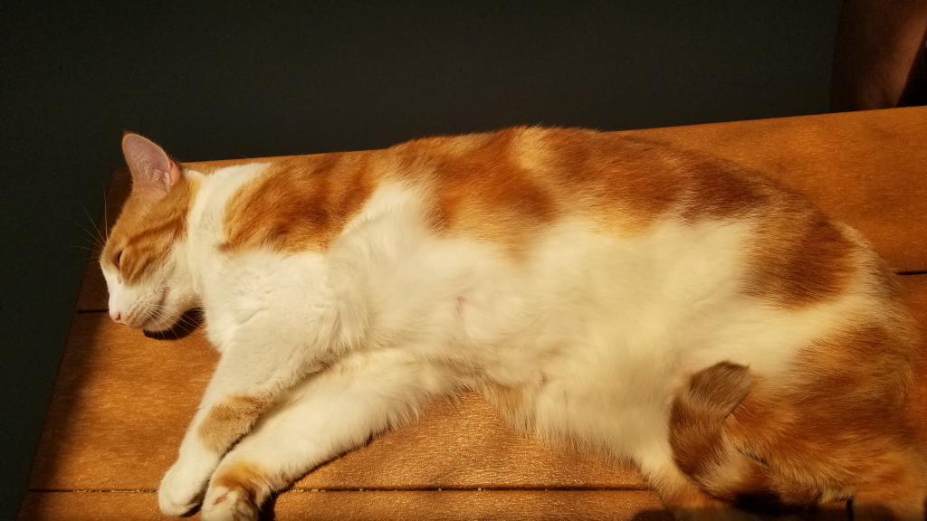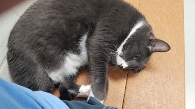 Many of those behaviors are in the past, partly because of Chris’s age but I think mostly because of his weight. He is what we affectionately call a “carb addict.” He loves his kibble. I try to not give him too much but he wears me down. He annoys the crap out of me when I am working so I give him a little kibble in order to get some work done. I usually do something else first so he won’t associate annoying me with getting what he wants but he is a smart cat and I doubt I am fooling him.
