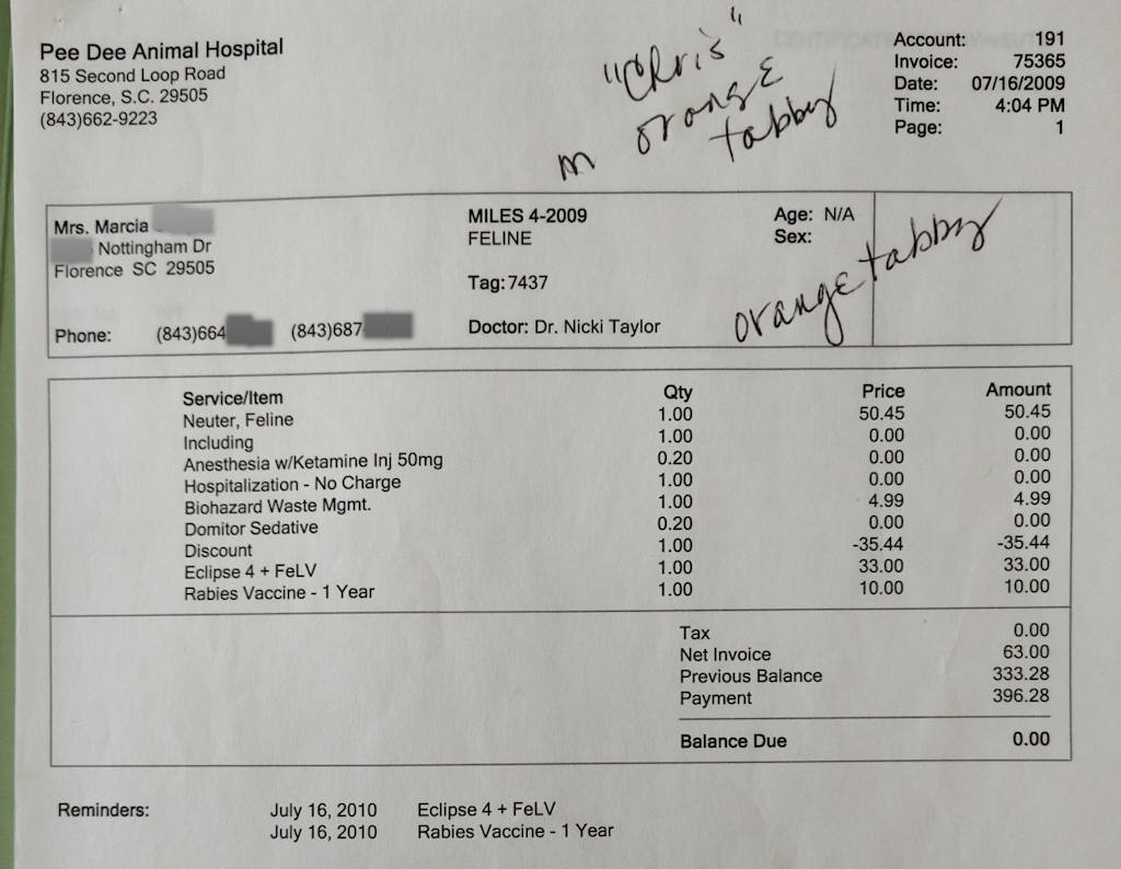 Update: After posting I decided to look up the name and learned she is listed as an agent of Care a Lot Rescue in Florance, SC. I thought about contacting them but the last record I could find for them was from 2013. I don’t know how to find them other than the address I have on the receipt. It might have been a small organization operated out of a home.