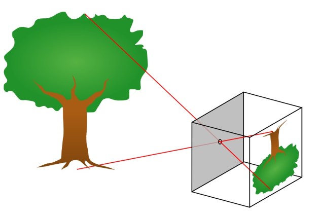 This is the most basic type of camera where a pinhole is made on one side of the box and photographic paper placed against the other side. To get a perfectly sharp image, the pinhole would have to be no wider than a single ray of light, but that would let in so little light that the exposure time would be extremely long. A larger opening would shorten the exposure time but then the light coming from the top of the tree, for example, would enter the opening through the top of the hole, the bottom, left, right, middle, etc. The light would then strike the film at slightly different spots causing the image to be out of focus.