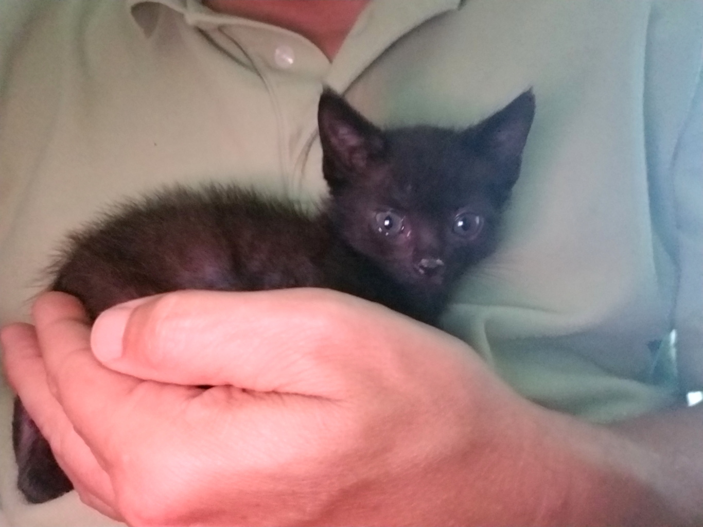 We talked for a few minutes and then the kitten showed up. I was amazed at how small the kitten was and I asked if he was old enough for adoption. “He is almost eight weeks old,” Chris told me (My son, coincidentally, is also named Chris). He said his littermates were twice as big as him.