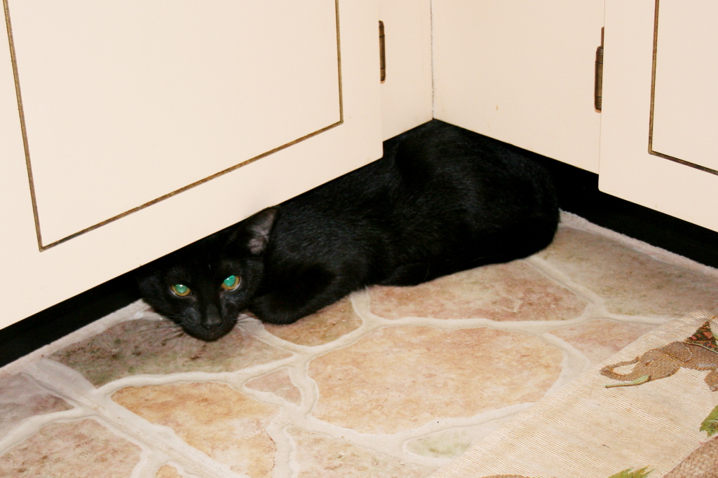 While Tigger was very outgoing, Flash was not. In fact, he was so nervous that he scrunched himself under our kitchen cabinet as soon as we let the two of them out of their carriers.