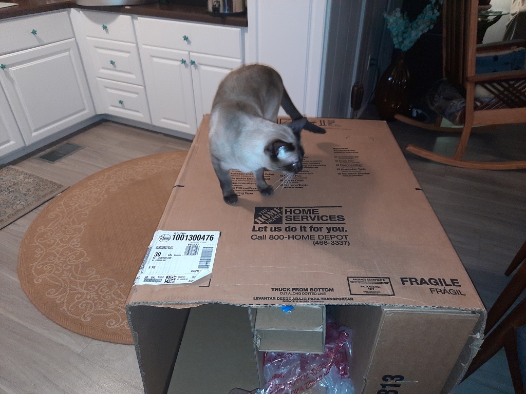 I shut the cat’s in the Florida room at 10:30 in the morning and they were stuck in there almost all day. I think it was after 6:30 when I decided that our multiple trips to Home Depot were over and everything else that needed to be done could be accomplished with the front do shut, so I let the cats into the house. Of course, the huge box in the kitchen caught their attention.