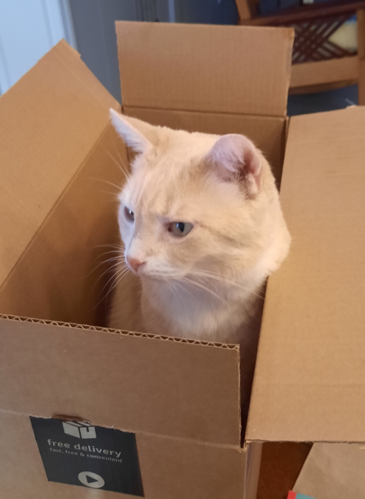 My wife got a shipment yesterday, removed the flaps on the box, and put it on the floor for the cats. I noticed Floki sleeping in it last night. This morning Rose couldn’t sleep and, while she was up, put a towel in the box. She woke me up when she came back to bed so I got up and saw Chris napping in the box.