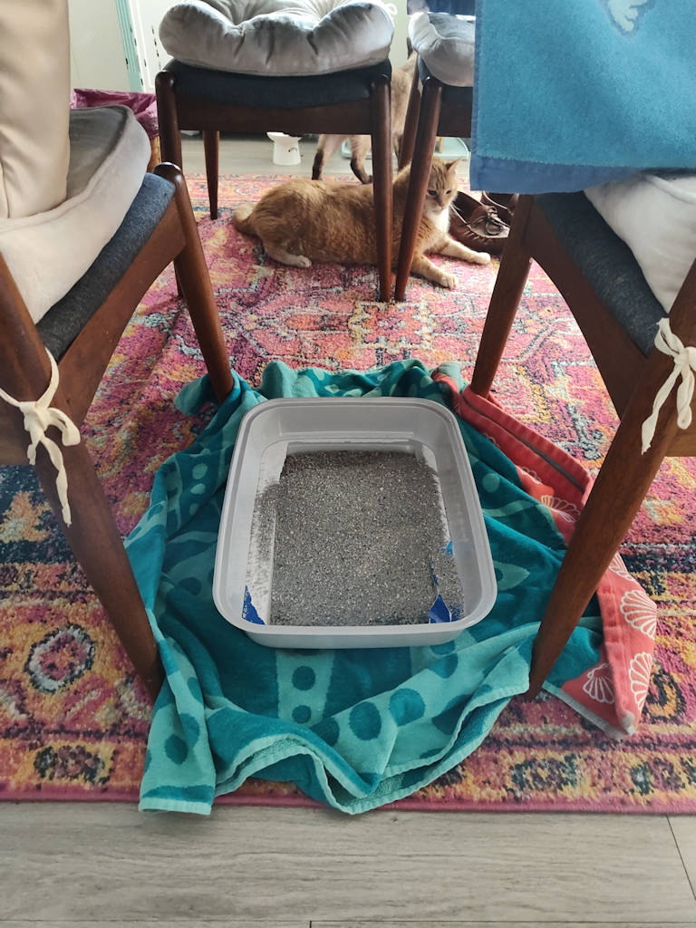 As an experiment, I picked up a disposable litterbox at the Grocery store on Friday and set it up under the dining room table.