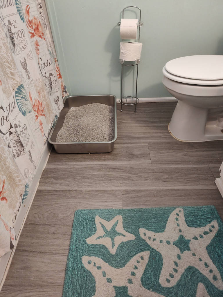 I ordered a large stainless-steel litterbox from Amazon that morning which is only four inches tall. It arrived Sunday. By then we had removed the rugs and washed them. We didn’t put them back because it seemed that Chris was targeting the rugs. I didn’t want to put the new box under the table, so I found room in a nearby bathroom.