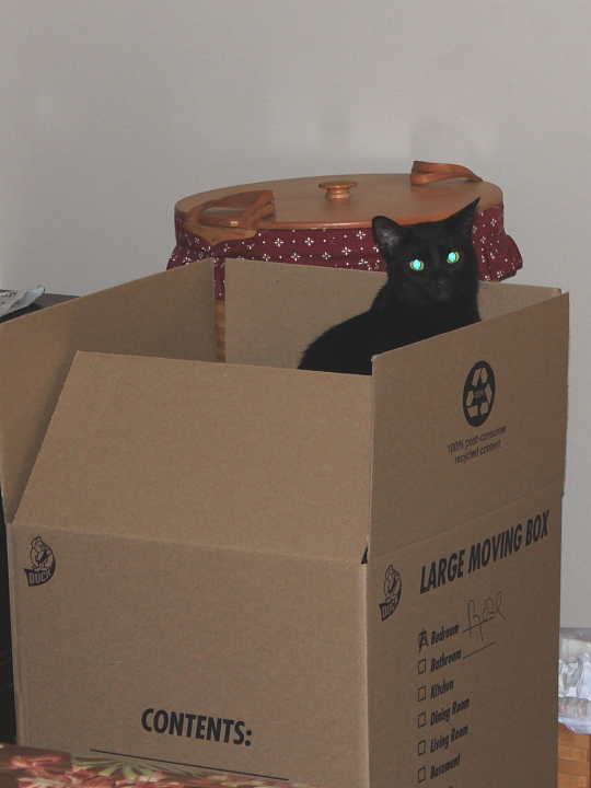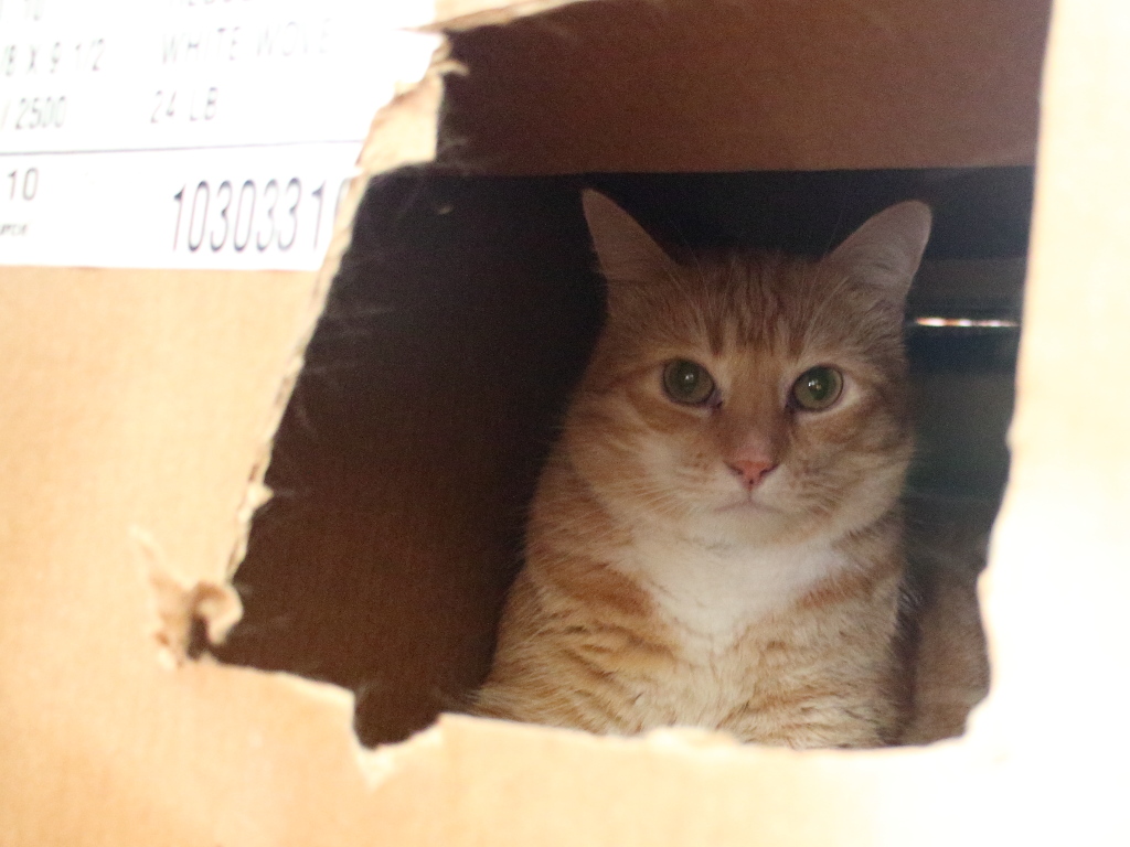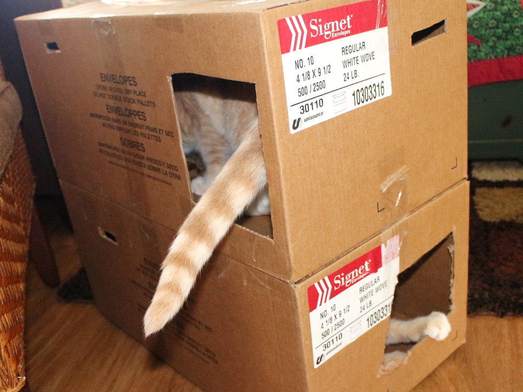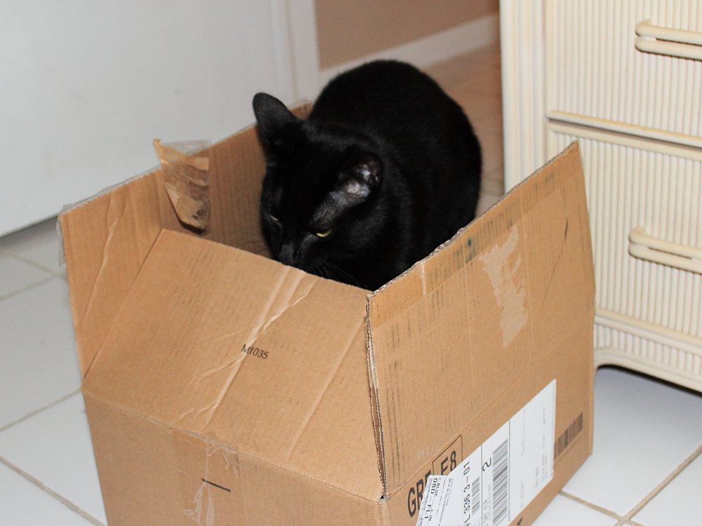 Puck was not interested at first but the next day, while I was sweeping up cat litter, I moved the box, thinking it was empty, and Puck came out. It has been a few days now and I find they are all still interested in the box from time to time. They must see it as a private getaway.
