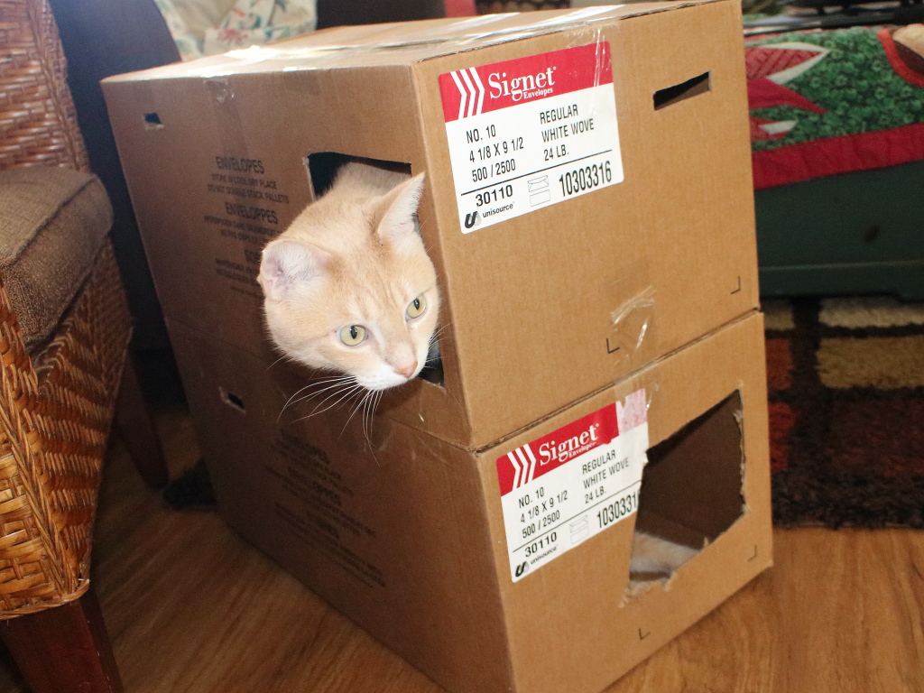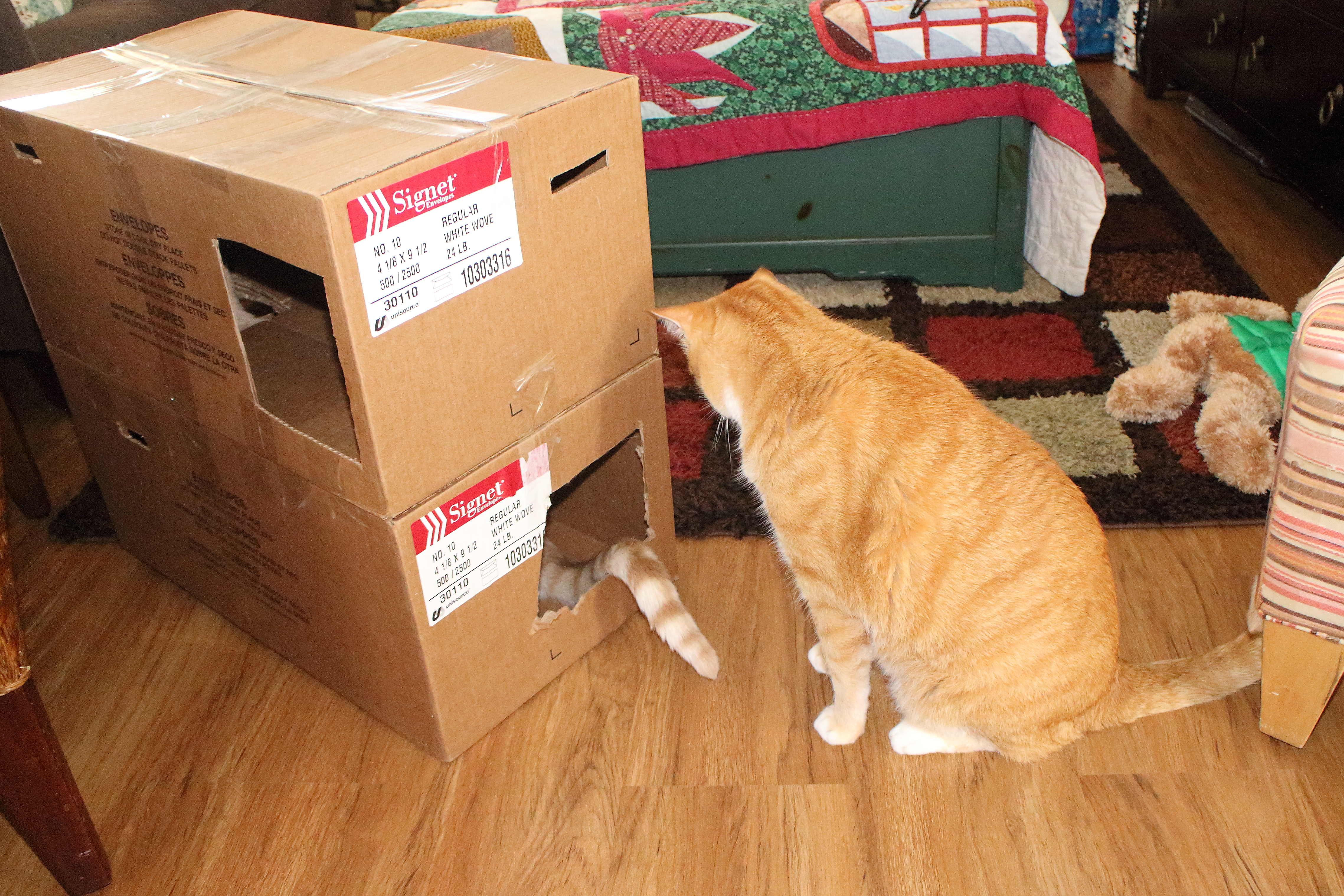 The original Fort Box was a hit with the cats but, if I remember right, Chris broke it by lying on top of it. It just wasn’t designed for his weight. I decided to make a new Fort Box that was bigger and better than the last one.