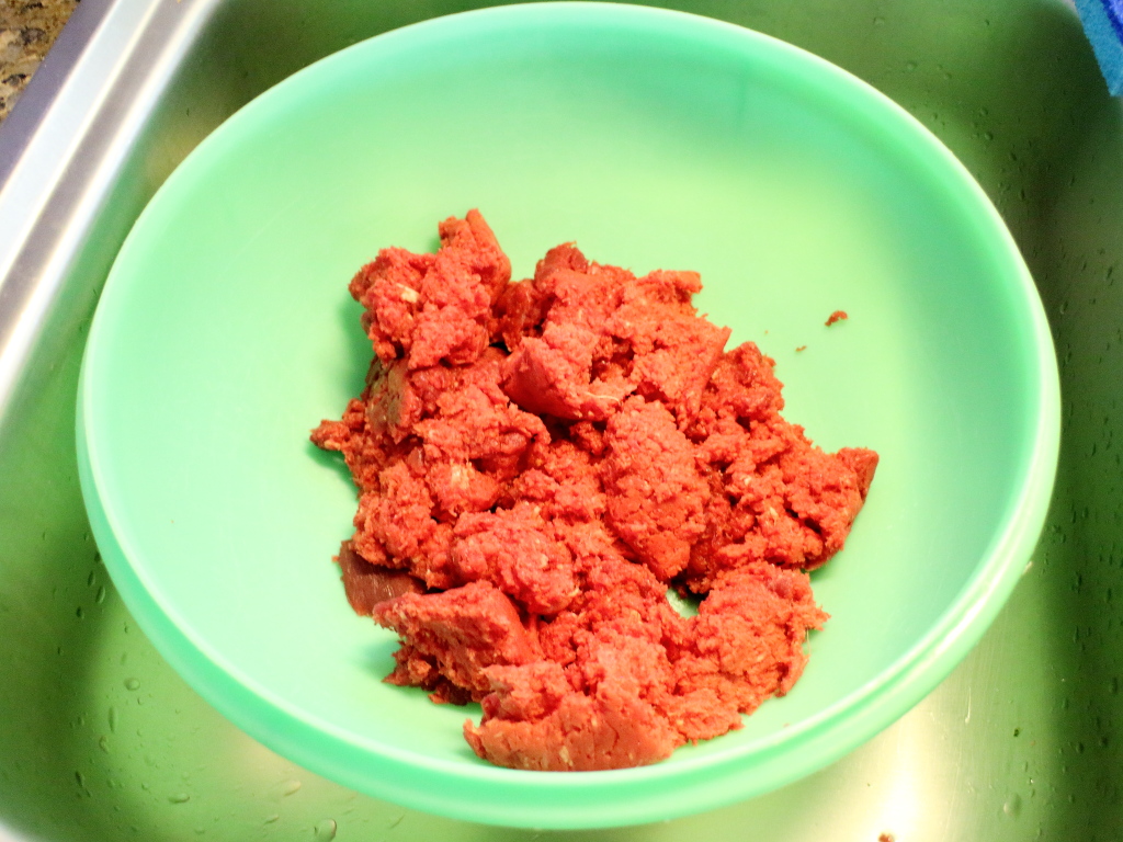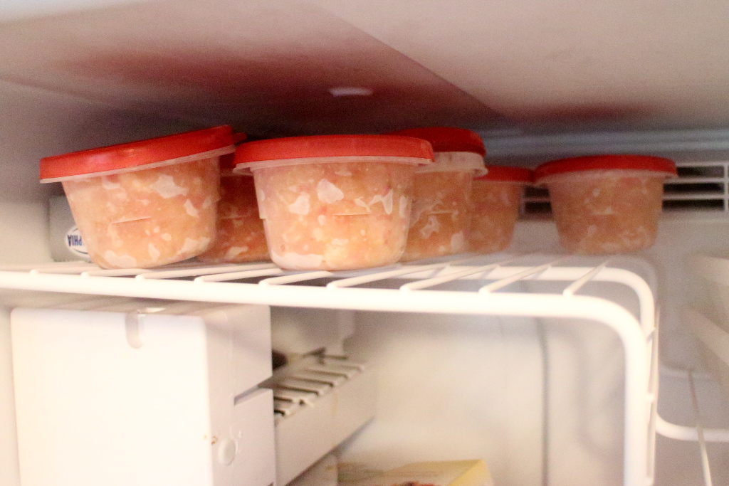 I keep the raw food in plastic containers in the freezer and make sure I have three in the refrigerator at all times. I then take the top container, which is about the same size as a large can of cat food, and warm it up in the microwave for twenty seconds. While I am doing that, I grab a frozen container and put it on the bottom of the two remaining containers. I know that heating raw food is not good but twenty seconds just takes the chill off. If I have time and remember to do it, I will instead place the container in warm water for ten minutes.