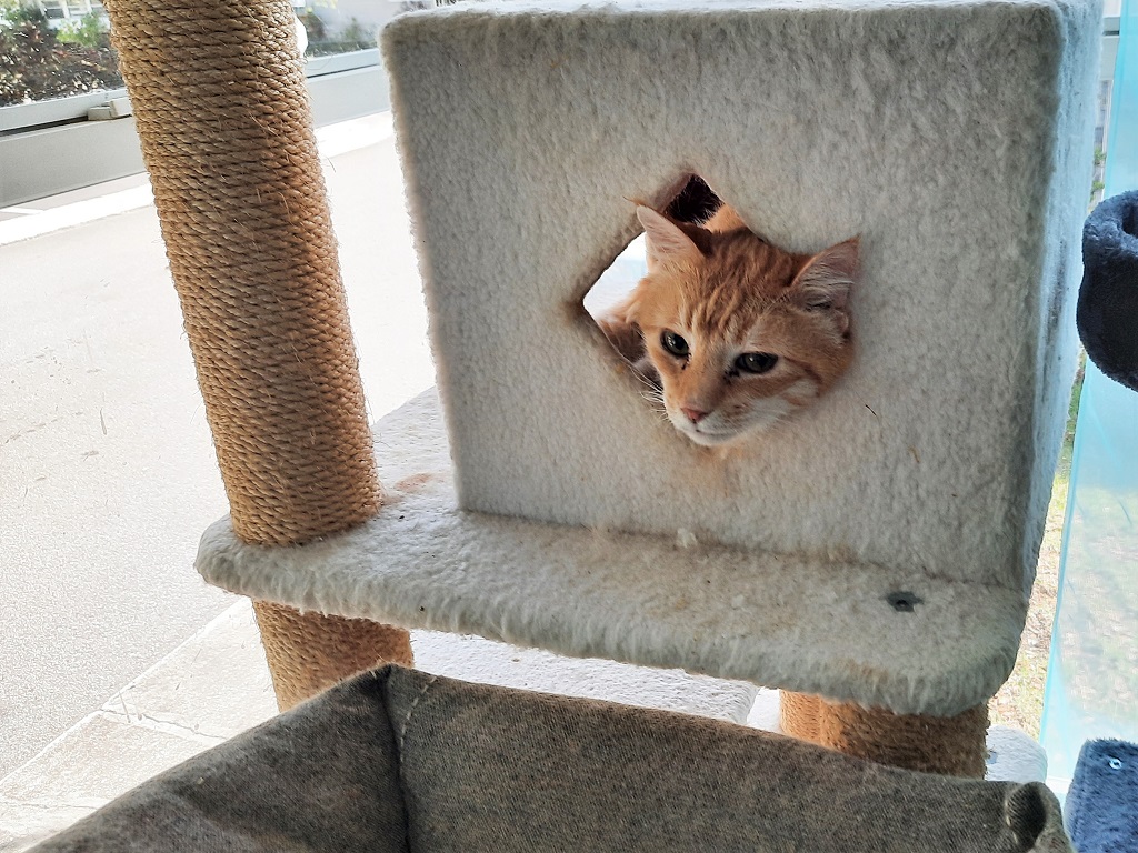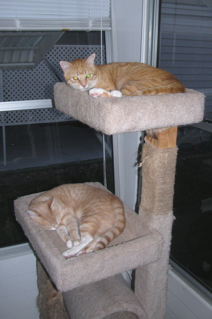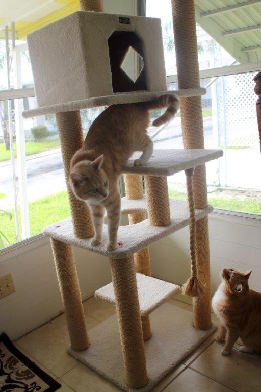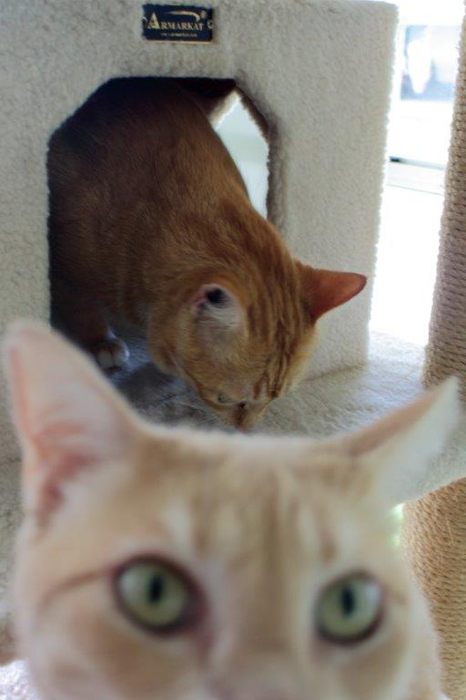 Frankie and Chris weren’t scared. They jumped at the chance to investigate the new tree. They checked out every inch of it, including the top shelf which was very close to the ceiling. They also seemed to like the little built-in house. Frankie even squeezed through the little window, I feat that Chris can only dream about these days.