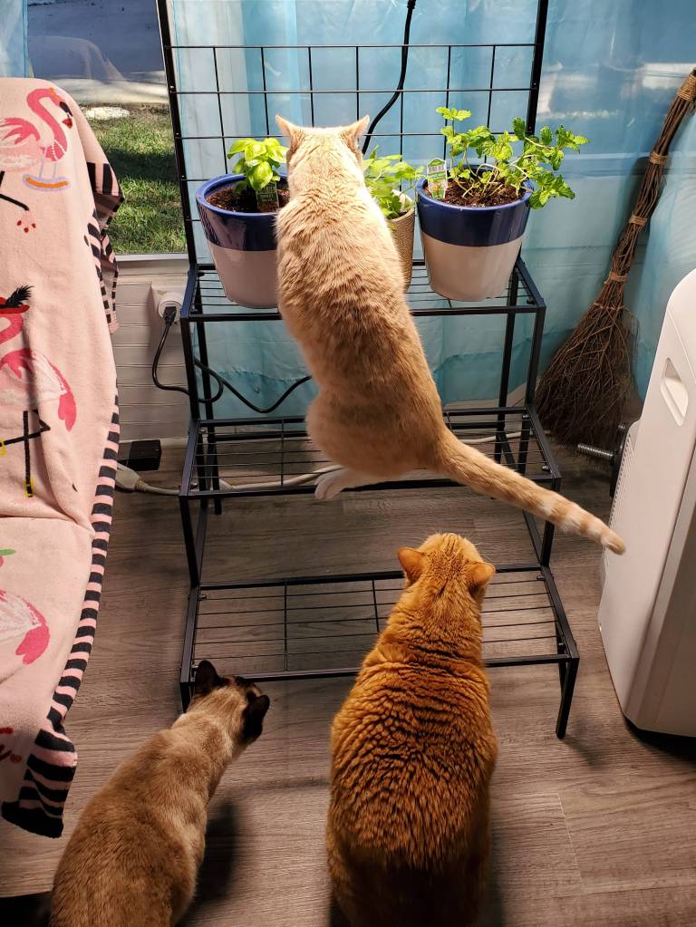 When I finished typing I looked through the door and saw Chris stretched as far as he could reach. He had one paw on the catnip plant and it was starting to tip over. “Hey! Hey! Hey! Hey! Hey! Hey! Hey! Hey! Hey!” I yelled, as I quickly made my way out to the Florida room. Chris let go but now Frankie and Floki were interested in what was going on.