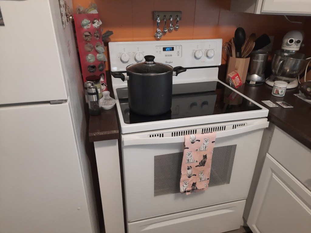 I had a pot of corn-on-the-cob boiling on the stove when Frankie suddenly developed the zoomies. He came barreling into the kitchen, jumped on the small ledge between the stove and the refrigerator, pushed the pot over several inches, and then quickly jumped down.