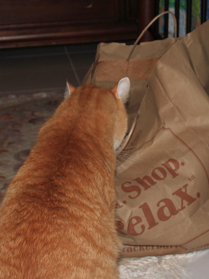 Cats love new things. Bring something new in the house and every cat will come out to give it a thorough inspection. That is especially true when you have to put that new thing together, as I did last night with a new shelving unit. All three of our cats were busy investigating every nook and cranny.