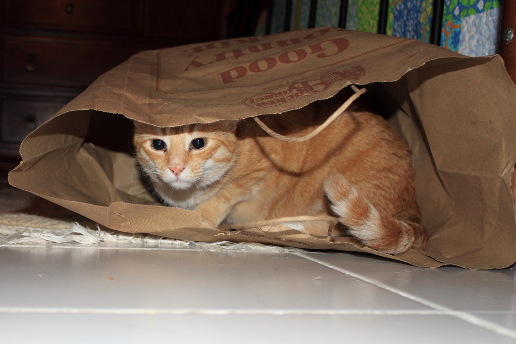 Paper or Plastic? Our cats are very conscious of the environment and much prefer paper. Of course, that could just be because paper bags are easier to climb inside of. Here is Frankie and Chris making good use of a paper bag.