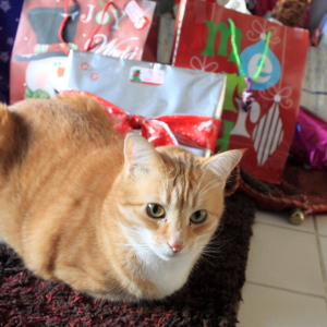 We adopted Chris in late 2009 from a shelter named Sav-R-Cats in Surfside, South Carolina (near Myrtle Beach). I met Chris while I was volunteering for Sav-R-Cats and worked with Shirley and Linda who are not only still there, but still keep up with Chris and his shenanigans. They decided to send Chris, Frankie and Puck a gift which arrived the other day.