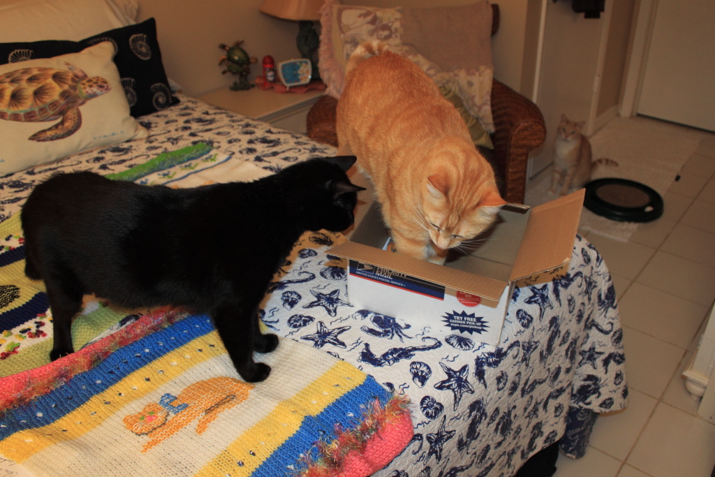 Frankie and Puck were interested right away, Chris was off doing his own thing and was not aware something new was in the house. As soon as I opened it, the two of them were inspecting the contents.