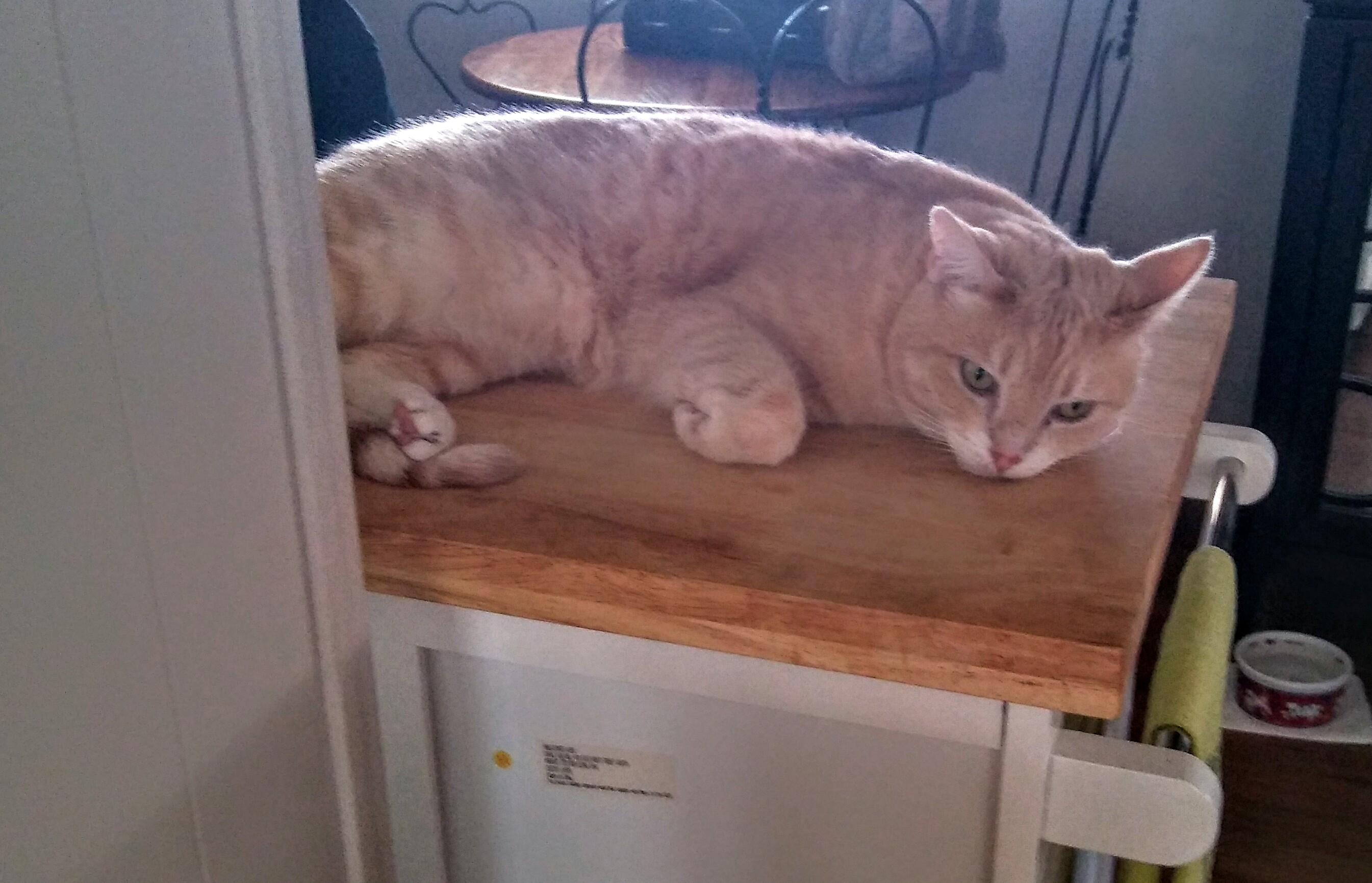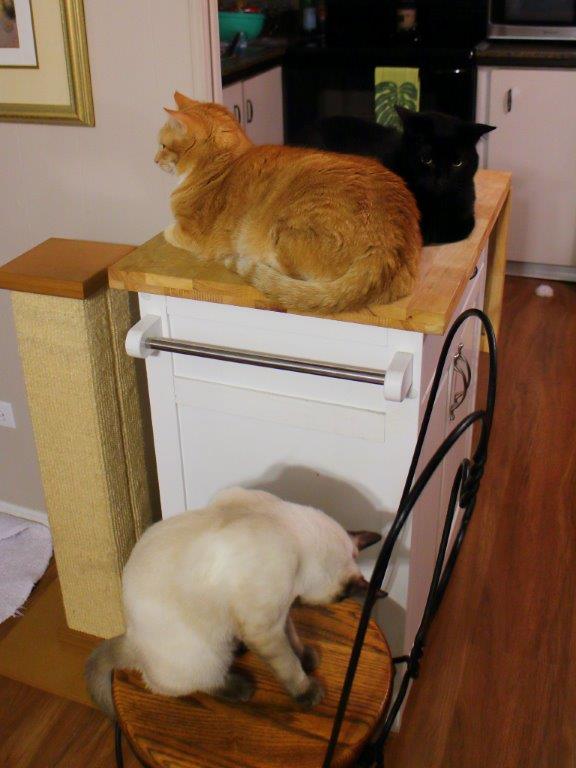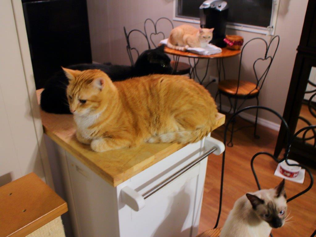 Last weekend we bought a kitchen utility cart and now it is the favorite spot for all our cat’s. Once the novelty wears off the appeal of it will probably die down, but now, even after a week, it is still popular. I just peeked around the corner to see Frankie sleeping on it.