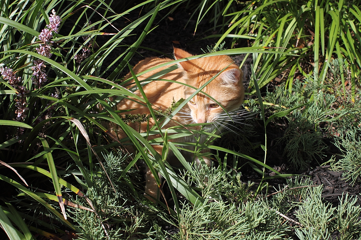 Chris soon stopped looking for lizards and started eating grass. I know it is natural for cats to eat grass so I would give him a few minutes before bringing him in.