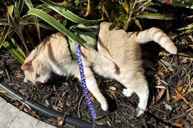 It occurred to me that if I wasn’t already happily married, and if I didn’t live in an old people’s community, walking a cat would be a great way to meet girls.