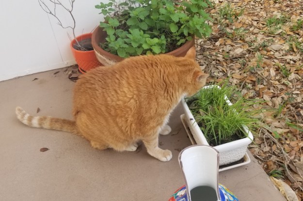 Sunday afternoon I was bringing a handful of laundry outside to the washing machine in our shed. I had just fed the cats and saw Frankie in the kitchen with his head in the food bowl. I figured it was safe to open the door, which I did quickly, and turned around to walk out backward so I could catch Frankie if he tried to get out. I obviously did it wrong because there was a second between when I cracked the door open and when I was turned around enough to see Frankie’s tail wiz past me.