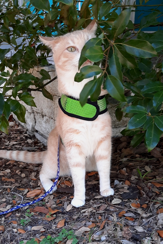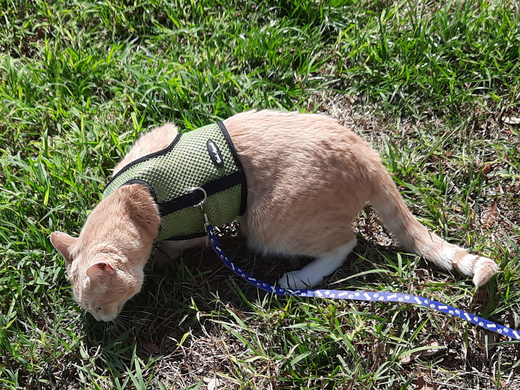 I should have tried to grab him then but I worried if I missed I would never catch him. Instead, I had an idea. I went back into the house and grabbed his harness. When I got close, I pulled it apart. He knows that the sound of the velcro means he is going for a walk so he came out and let me put it on. Unfortunately, I was rushed and put it on upside down. In the process of trying to reverse it, I nearly freaked him out a little. Before he got too nervous I turned it around and soon we were walking.