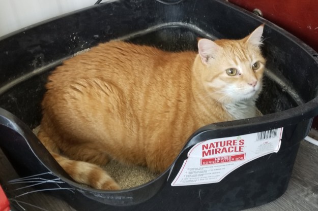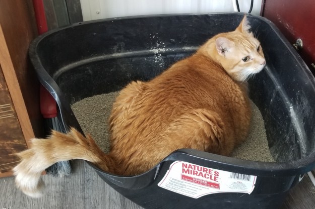 Another thing Chris does lately is lie in the litter box. I don’t know if he feels like he has to puke and wants to be ready, or if he is just getting weird in his old age.