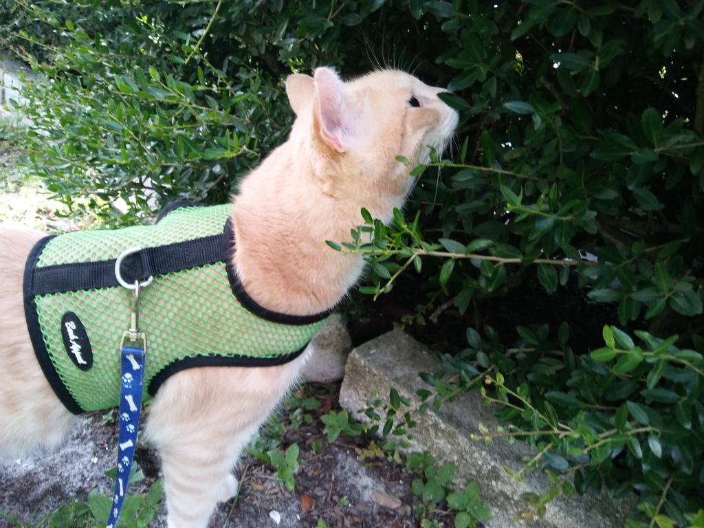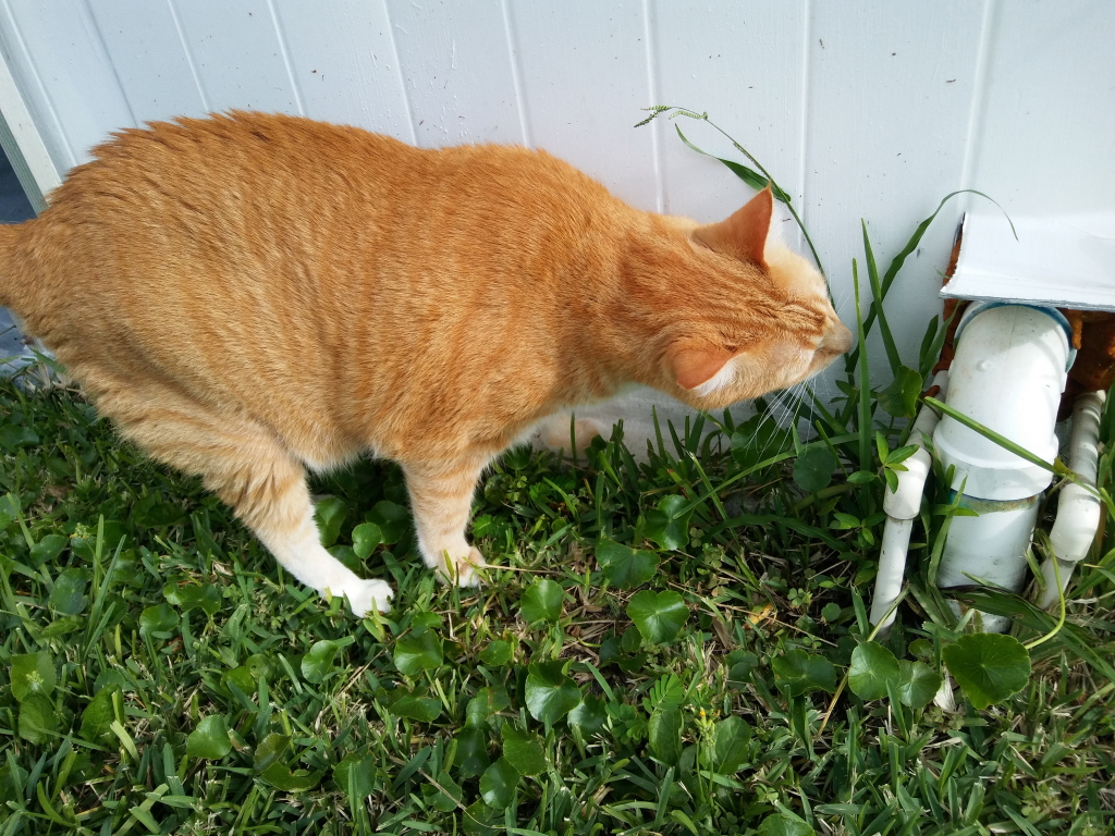 I put Chris in the house and went inside to wait for him. After a little while. while I was cleaning the litter boxes, I looked out the window and saw him out from under the car and very interested in a nearby tree. Then he jumped into the tree.