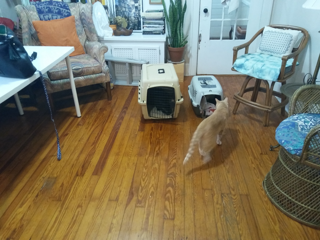 Saturday morning we packed up everything but the kitchen sink and loaded it into our two cars. We then had to pack up the cats, which is not an easy thing to do. The plan was to put Frankie and Floki in the big carrier but Floki was so difficult to catch and contain that we just put him in the closest carrier, which was a small one, and then put Puck in with Frankie. I then put Frankie’s harness on Chris. We thought Chris would be the best choice to go without a carrier because he seems to stress out less than the other cats.