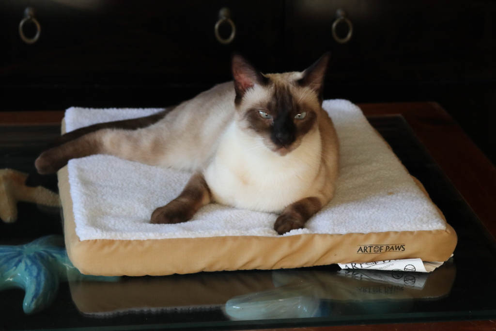 I ended up putting the bed in its open position on our coffee table. Frankie, Floki and Puck mostly ignore it but Chris loves it. I see him on it often. He is on it as I write this.