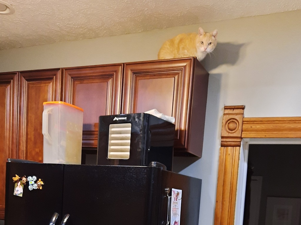 I thought he was after the catnip but that was on the second shelf and he was clearly interested in the first shelf. I looked at what he was looking at and found a ziplock bag with flavoring that came with my order from NomNomNow. Someone already chewed through the original packaging which is why it was in a ziplock bag. The flavoring helps to get finicky cats used to the new kind of food but our cats never needed an incentive to eat it so I just put it in the cabinet. I put the bag on the top shelf above the bag of Tostito’s that was up there. I figured it was way out of his reach.