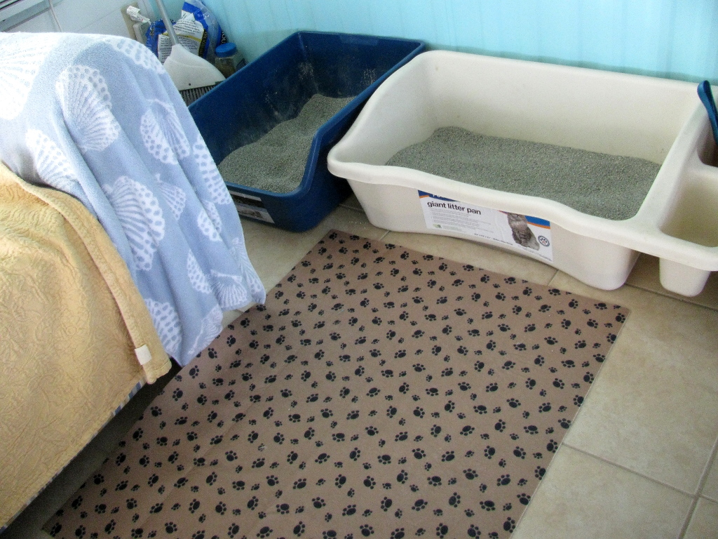 I noticed recently that someone was peeing over the side of one of the litter boxes. I would often find pee on the floor between the blue litter box and the cabinet.