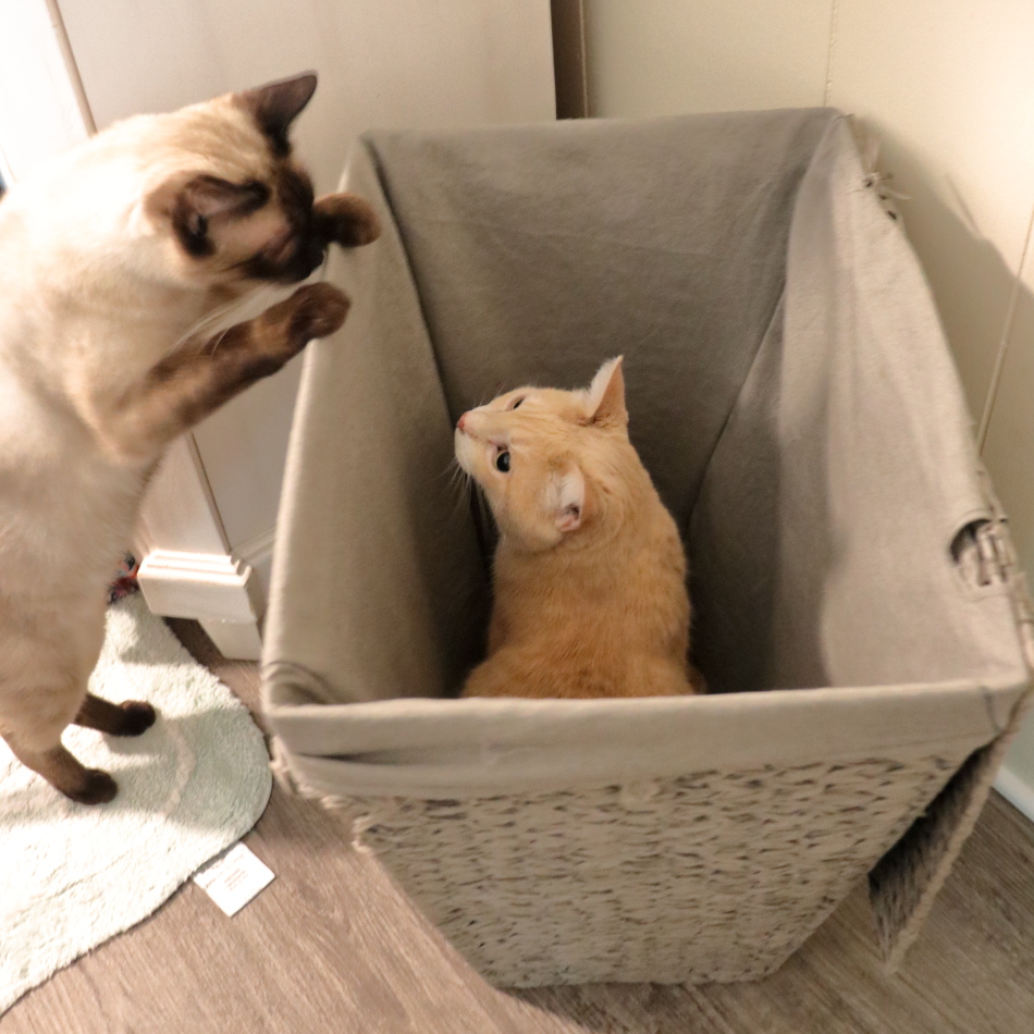 Frankie is attracted to our laundry basket like flies to shoot I lost my train of thought. Anyway, when I bring it in empty he has to get inside of it. Usually he tips it over but this time I had the cover open so he just jumped inside. Of course, Floki had to investigate what he was doing.