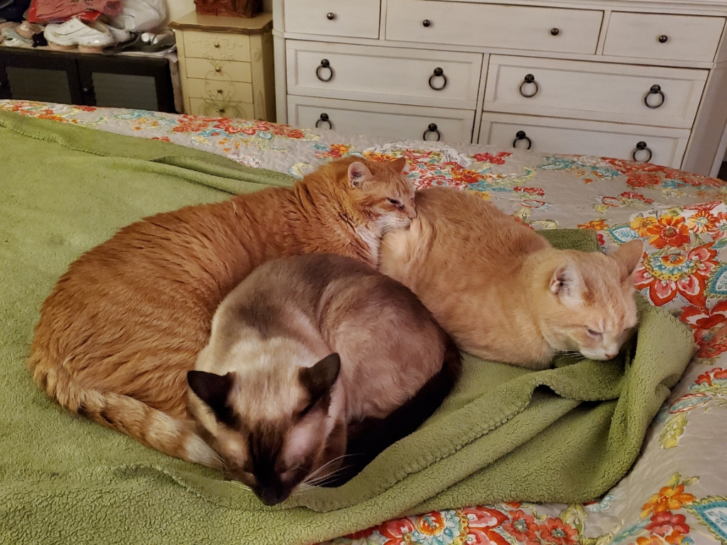 It is pretty cool that our cats get along as good as they do. This photo was from Wednesday evening but as I write this on Thursday evening they are all grouped together on the bed in a similar way.