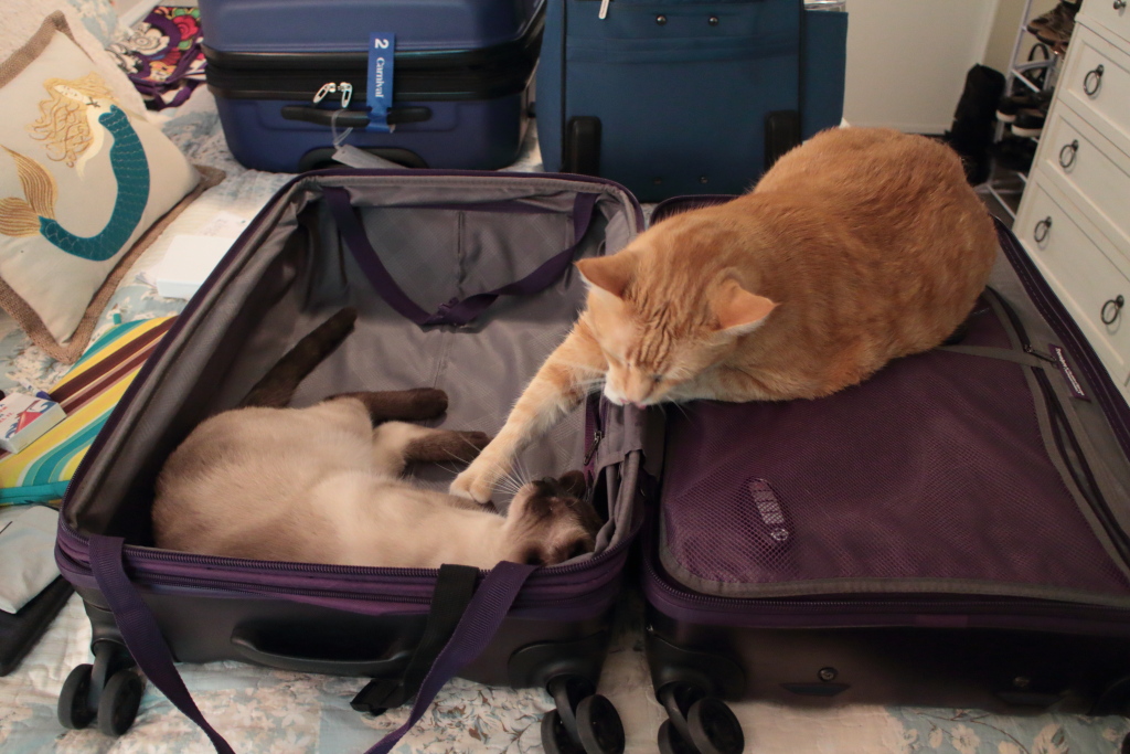 My wife left on a business trip yesterday and she had plenty of help packing for it. Each of our cats did their part in making sure Mom got off to a good start on her trip.