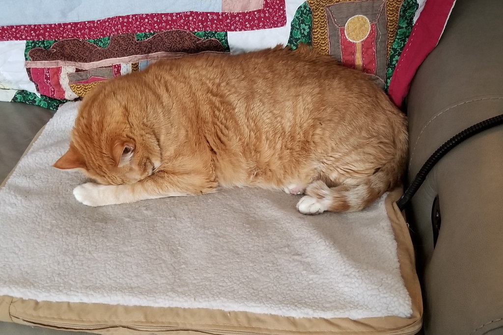 We got our Art of Paws Heated Pet Mat six years ago. Since then, we have been using it without the heating element most of the time. I put the heating element back in when it gets cold, which isn’t very often in Florida but it did come in handy when we were in West Virginia. It hasn’t been particularly cold here lately, but we have woken up to temperatures in the forties a few days these last couple of weeks.