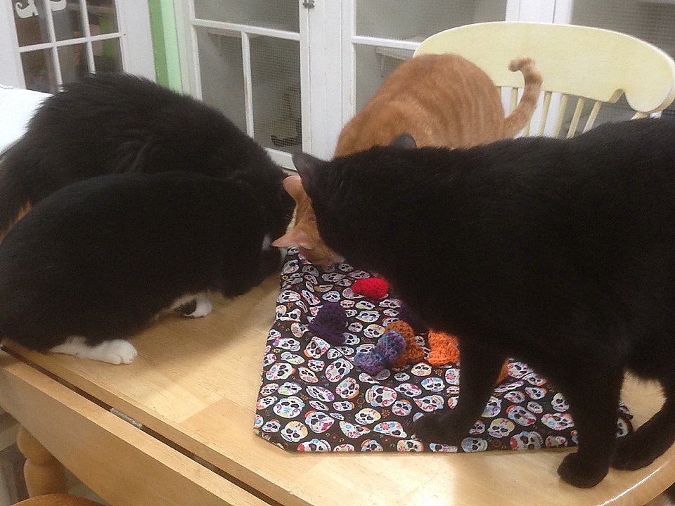 I got the following pictures from Shirley, the shelter manager at Sav-R-Cats, and it looks like the prizes were a hit.