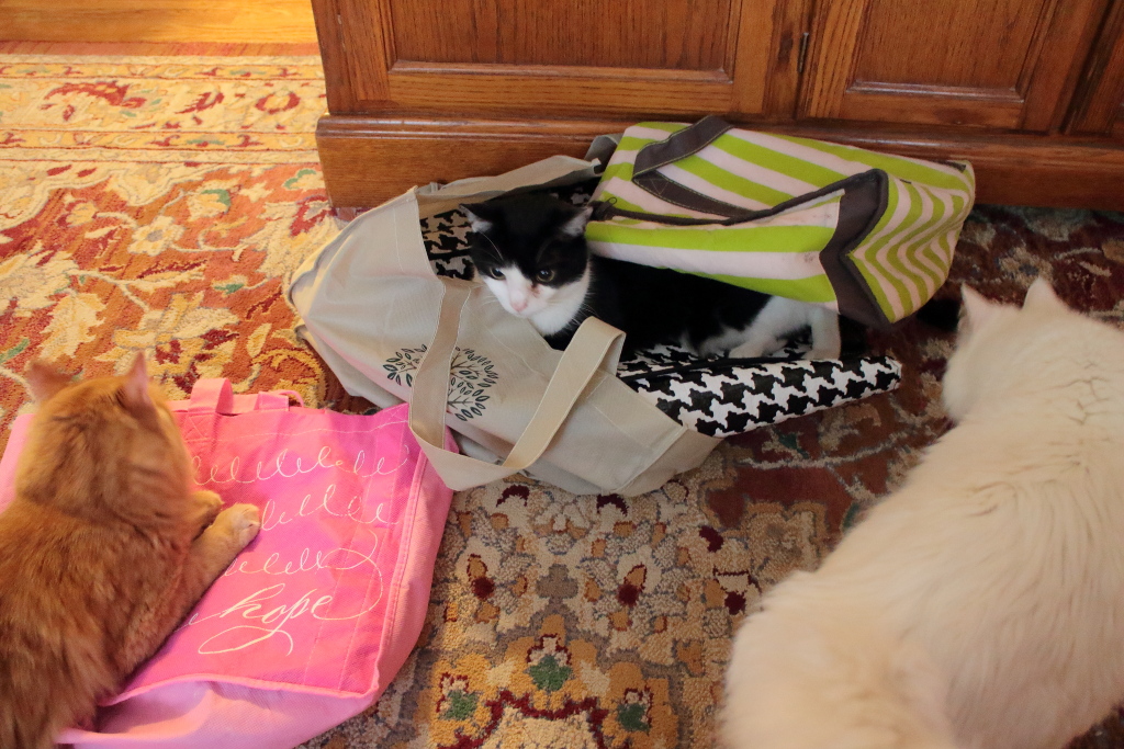 Brayden is an active young man who turned three in October. Floki does not like the disturbance caused by the presence of a child and spent most of the time hiding. Frankie kept his distance and hung out on the bed. He gave Brayden a hiss or two when he got too close. Chris, on the other hand, gracefully put up with him.