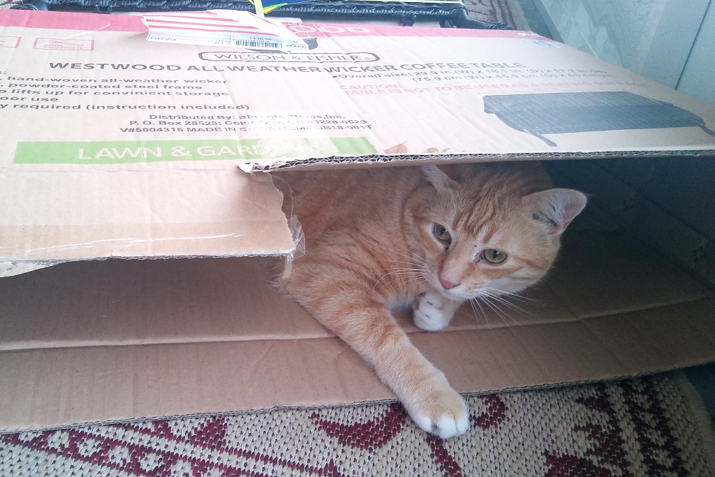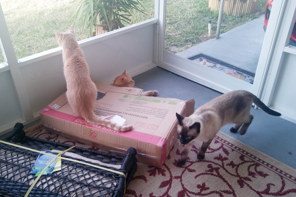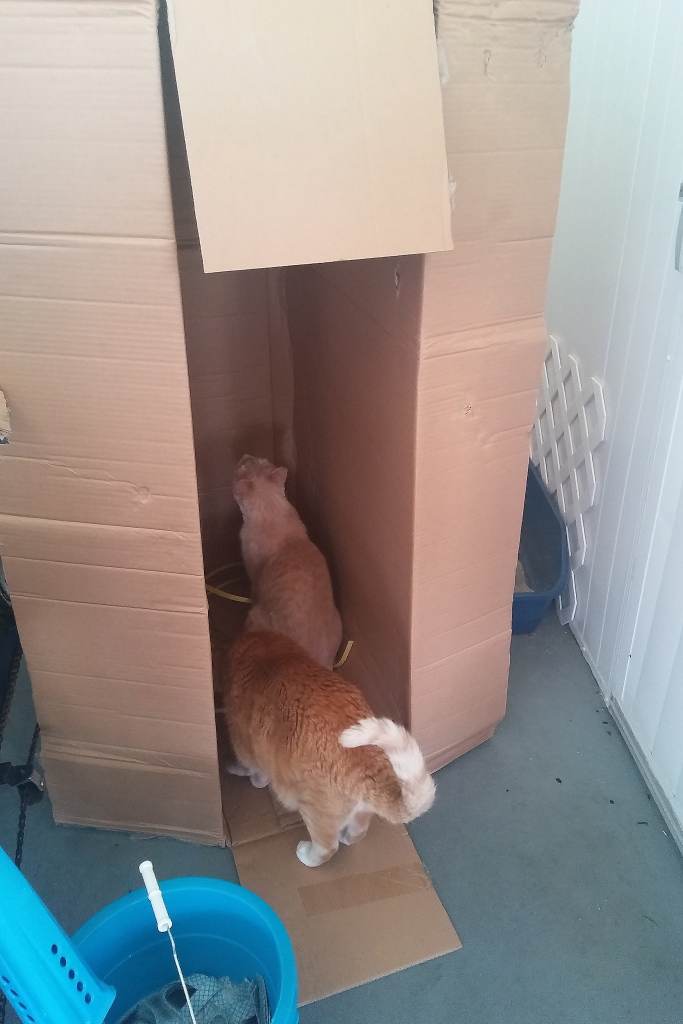 Last week I took out the trash which can be a pain sometimes if a cat is outside on the catio. Our garbage cans are outside the back door of the catio and opening that door will cause Chris and Frankie to immediately run toward the door to try to get outside. Sometimes I quickly throw the trash on top of the can and close the door with the intention of putting it in the can later when it is safe. On this day I saw no cats so I thought I had time to open the door and put the trash inside the can. While I was doing that, Chris and Frankie bolted out the door at the same time. I either didn’t see them on the catio or I didn’t fully shut the door to the house.