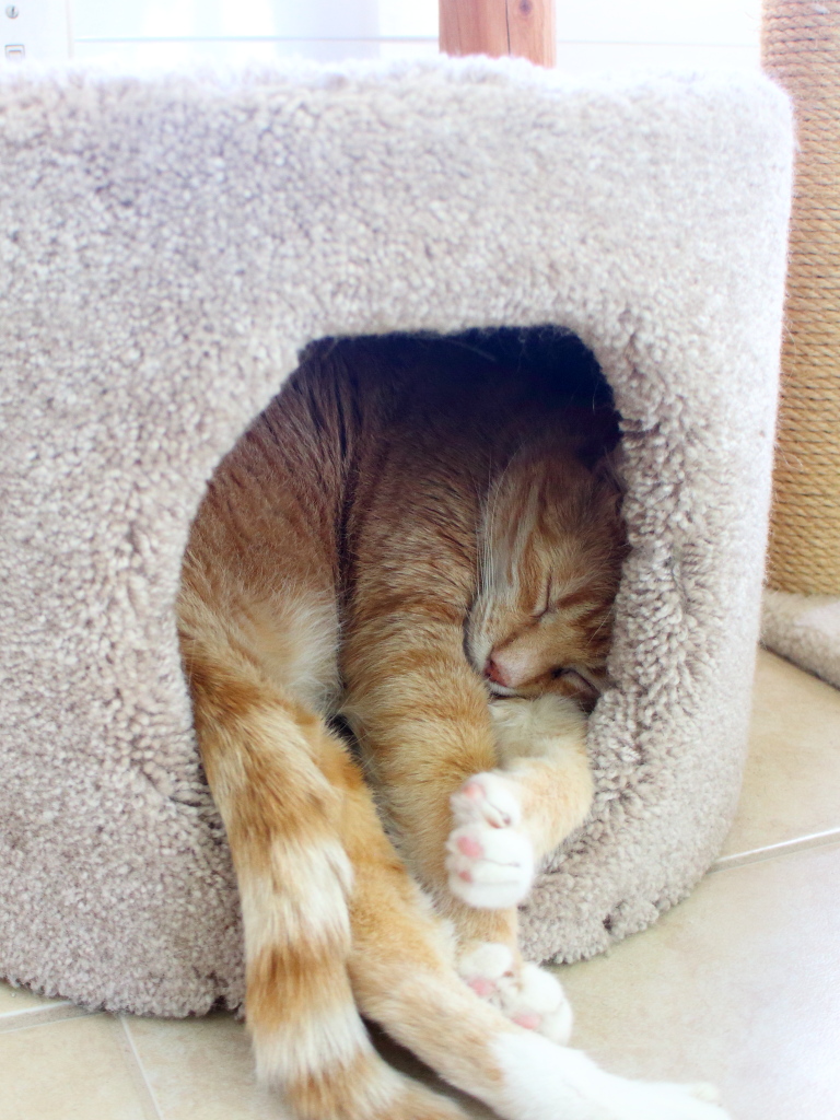A little while ago I watched him climb up to one of the cat perches. He first jumped up onto his crate, moved over to the tall cat perch, climbed up the “steps” and then over to the Z shaped perch and finally to the where he is in the photo below.