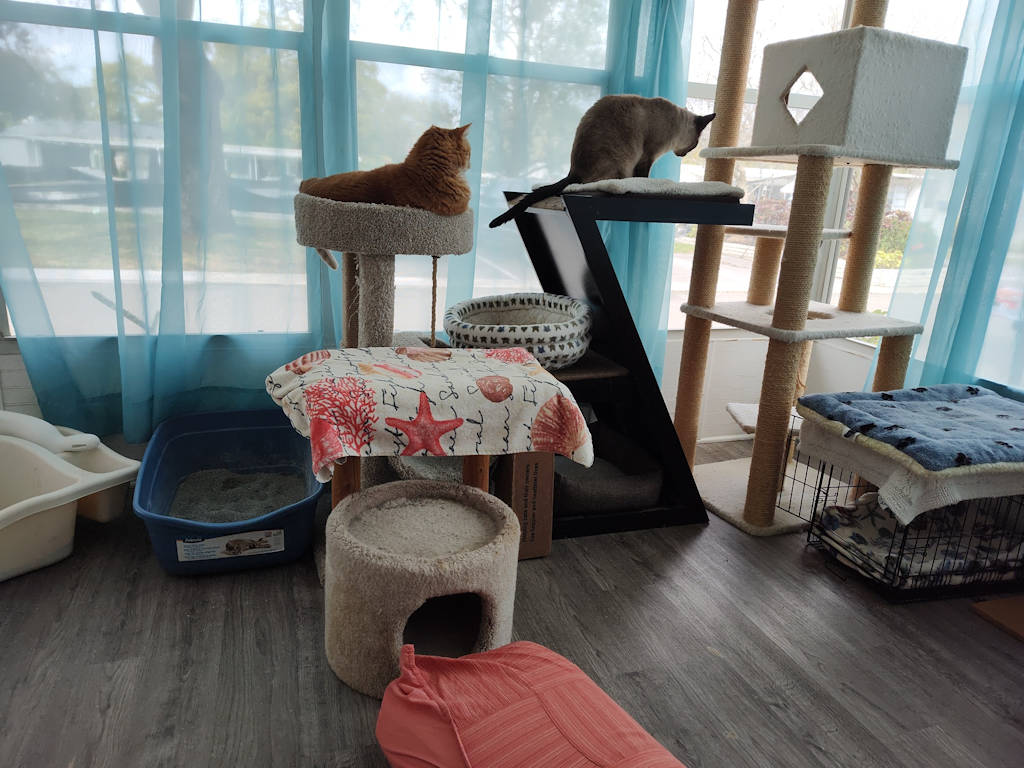 It looked like Chris wanted to jump to the floor, which would surely have hurt him if he tried, so I pushed a shorter cat perch next to him and then put a pillow on the ground to hopefully keep him from hurting himself on the way down.