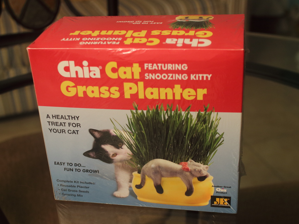 For Christmas, the cats’ Aunt Felice got them a Chia Cat Grass Planter. A great present because they all like grass and Chris loves it. Whenever Chris gets outside, the first thing he does is eat some grass.