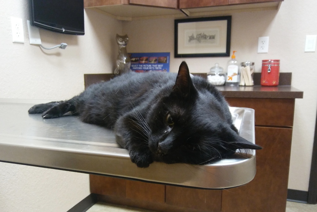 The vet tech came in and took Puck to the back room where they do their secret experiments. She then brought him back and the vet came in and examined Puck. The vet said his bladder felt full and he could be blocked. She tried to get some urine out of him but couldn’t. As we waited for lab tests the vet drew up a treatment plan which was going to require Puck to be there overnight and possibly for a few days. I don’t remember the details but she did say something about a catheter.